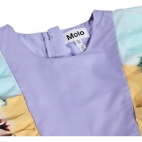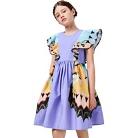 Purple dress made of soft viscose with an elegant butterfly wing print. The top is sleeveless with a ruffle edge that starts at the waist, falls lightly over the shoulders, and continues onto the back. The skirt has a circular cut and is voluminous, made of light cotton poplin, which gives the dress a light and airy look, while an invisible zip on the side makes it easy to put on and take off.