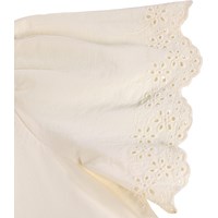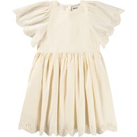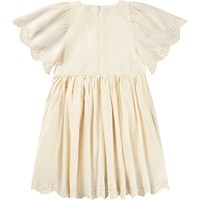 Off-white dress made of soft, organic cotton with elegant broderie anglaise at the sleeves and bottom. The dress has a round-cut, voluminous skirt made of light cotton poplin. The top has soft butterfly sleeves that fall gently over the shoulders, as well as an invisible zip at the back for easy dressing and undressing.