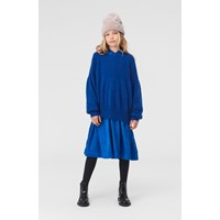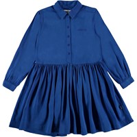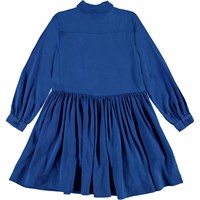 Caya is a blue shirt dress with long sleeves. It has a high neck and a button closure on front.