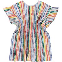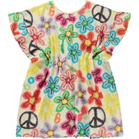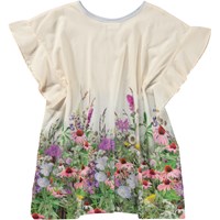 Light cream coloured tunic with ruffle sleeves and a placement print on the front. It is in 100% organic cotton. The print shows horses galloping through a beautiful wild meadow. The tunic is easy to wear for a day at the beach over a swimsuit. This style is in an oversized fit. For a more snug fit, or for a child who is between two sizes, we recommend buying one size down.