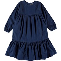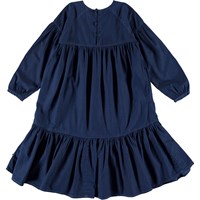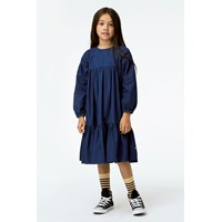 Cecily is a dark blue denim dress with long sleeves. The dress is in a roomy fit with white stitching and a zipper at the neck.