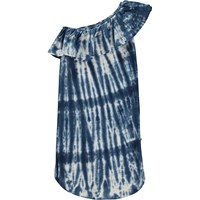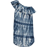Chadee is an asymmetrical dress in blue with a tie-dye print. The dress has a beautiful, slanted fit with a large ruffle collar.