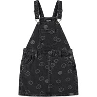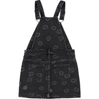 Dark grey, knee length dungaree dress in an all over smiley face print. The smiley faces are woven into the print for an exclusive look. This dungaree dress is in 100% cotton, has braces with dark metal hardware, a front pocket as well as side pockets and back pockets. The dress is in a regular fit. Wear the dress with the Hiro jacket in the same print for the perfect set.