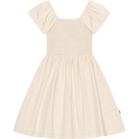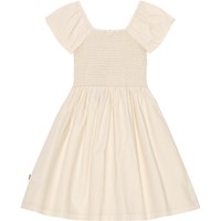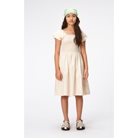 Sand coloured, knee length dress in organic cotton. It has a square neck, short puff sleeves. The top of the dress is in a smock effect that gives the skirt its extra fullness.