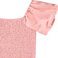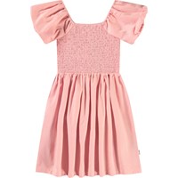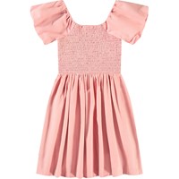 Pink knee-length dress in organic cotton with a square neckline. The dress has short sleeves with a puff effect, and the top is fitted and sewn with a smocked effect, giving the skirt gathers and fullness.