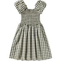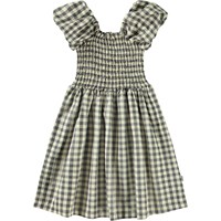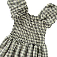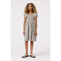 Checked beige and grey knee-length dress in a soft cotton blend with a square neckline. The dress has short sleeves with a puff effect, the top is fitted with a sewn smocked effect, which gives the skirt gathers and fullness.