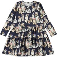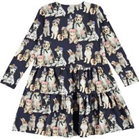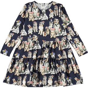 Chia is a dress with a print of various animals with hats on. The dress has long sleeves and is in a loose, comfortable fit.