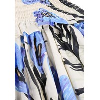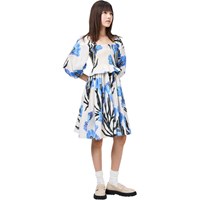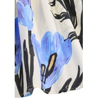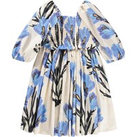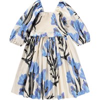 Off-white dress made of soft, organic cotton poplin with a blue floral print on both the sleeves and skirt. The dress has a square neckline and a close-fit top with a smock effect, providing a flexible and comfortable fit. The sleeves are three-quarter length with a slight puff and finish with elastic, and the skirt is voluminous, giving the dress a light and airy look.