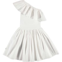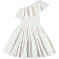 Chloey is a dream of a white dress. It is asymmetrical and has a ruffle edge over one shoulder. The top of the dress is in rib while the full skirt is in organic cotton poplin.