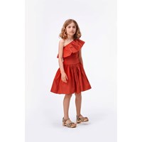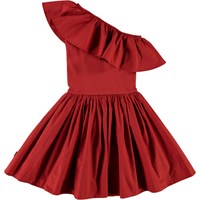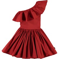 Chloey is a dark red dream of a dress. It is asymmetric with a ruffle edge over one shoulder. The top is in rib and the full skirt is in an organic poplin quality.