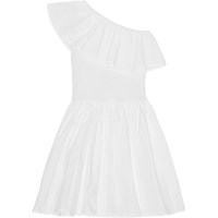 White ,one-shoulder kjole i økologisk bomuld. Kjolen har en bred poplin flæse langs halsudskæringen, en tætsiddende ribbet overdel samt en voluminøs underdel med et knælangt, rundskåret skørt.