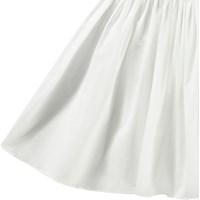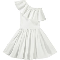 White one-shoulder dress in organic cotton. The dress features a wide poplin ruffle along the neckline, a snug ribbed top, and a voluminous bottom with a knee-length, circular-cut skirt.