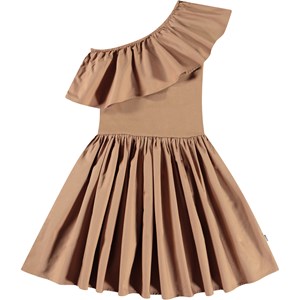 Light brown one-shoulder dress in organic cotton. The dress features a wide poplin ruffle along the neckline, a snug ribbed top, and a voluminous bottom with a knee-length, circular-cut skirt.