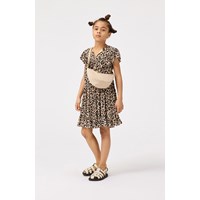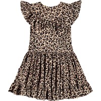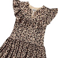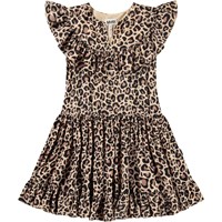Leopard print knee-length dress in viscose with a round neck and V-cut at the front. The dress has a loose fit with a ruffle at the bottom, on the front, back, and across the shoulders, forming a small sleeve.