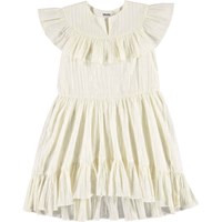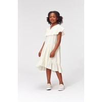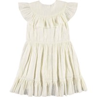 Cho is a white dress with metallic stripes. It has a ruffle across the chest that continues up the shoulders and becomes the sleeves. The full skirt of the dress has a ruffle at the bottom.