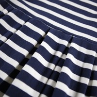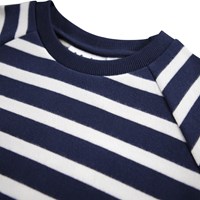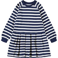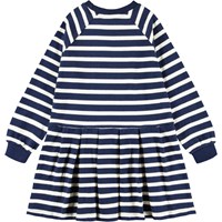 Long-sleeved sweatshirt dress made of organic cotton with Breton blue and white stripes. The dress has raglan sleeves, blue ribbed edges around the neck and sleeves, as well as an attached skirt with pleats, which gives a nice effect.