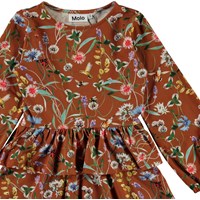 Christabelle is a long sleeve brown dress with a print of wild flowers and small insects. It has a peplum skirt and full sleeves.