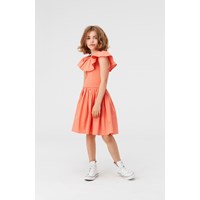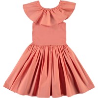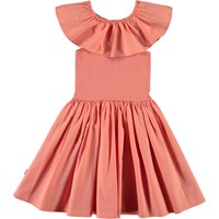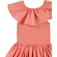 Christal is a sleeveless coral coloured dress where the top is in rib with a large ruffle collar and the full skirt is in poplin.