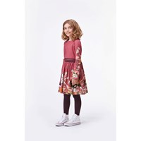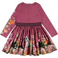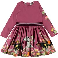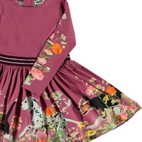 Christin is a fuchsia coloured poplin dress with stretch. On the skirt, it has a print of dogs that are running through flowers, and it has flowers down one sleeve. It also has a striped waistband and a zip closure at the neck.