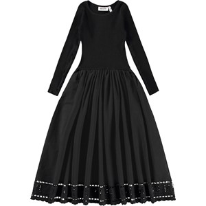 Long-sleeved black dress in organic cotton with a fitted ribbed jersey top, round neck, and a voluminous full-circle skirt in cotton poplin. The skirt features an embroidered edge with the text 'You Matter'.