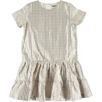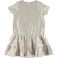 Cicely is a golden, dreamy dress in plaid. The dress has short sleeves and a zip closure at the neck.
