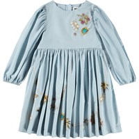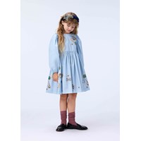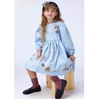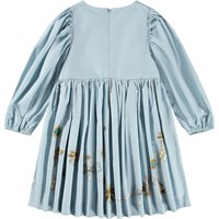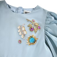 Knee-length light blue dress made of organic cotton poplin with a print of jewelry. The dress has a round neckline, is slightly oversized and has plenty of gathers at the sleeves and skirt. The long sleeves have elastic around the wrists to make the sleeves full. The dress is easy to put on with the invisible zipper at the back.