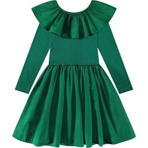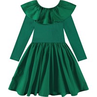 Green knee-length dress in organic cotton with a fitted jersey top and a voluminous cotton poplin skirt. The dress has long sleeves and a poplin collar that can be worn off-shoulder.