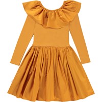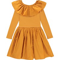 Cille is a golden, 'one of a kind' dress that's both comfortable and looks great. The dress has a skirt, a top in a rib quality and a large, full collar.