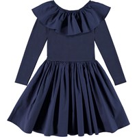 Cille is a 'One of a kind' dress, which is both extremely comfortable and looks great. The dress is long sleeved and dark blue with a rib top and a peplum skirt and a big, full collar.