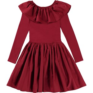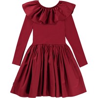 Cille is a dark red, 'one of a kind' dress that's both comfortable and looks great. The dress has a skirt, a top in a rib quality and a large, full collar.