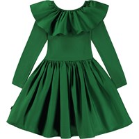 Green, knee length dress with long sleeves and with a poplin collar and skirt. The poplin collar has elastic and can be worn on the shoulder as a collar or off the shoulder as sleeves. The dress is in 100% cotton jersey, while the collar and skirt are in 100% cotton poplin and is in a slim fit.