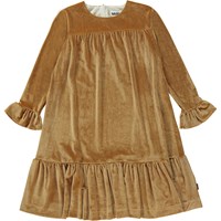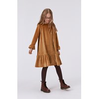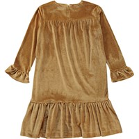 Gold midi dress with long sleeves and ruffle details. This dress is in a lovely velour quality that highlights the golden colour. It has a round neck, a yoke, a hidden zip closure on the back, long sleeves with ruffle details and a low hip with ruffles sewn on for lovely movement. It is in a loose fit.