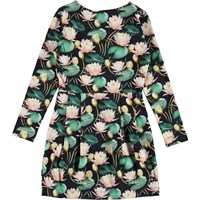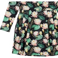 Cindarell is a long sleeve dress with a print of pink water lilies. The dress has long sleeves and is body conscious without being tight and form-fitting.