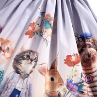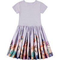 Light purple short-sleeved dress made of organic cotton with a fitted ribbed jersey top and poplin skirt. The dress has a regular fit with a cute print of animals dressed in cute clothes.