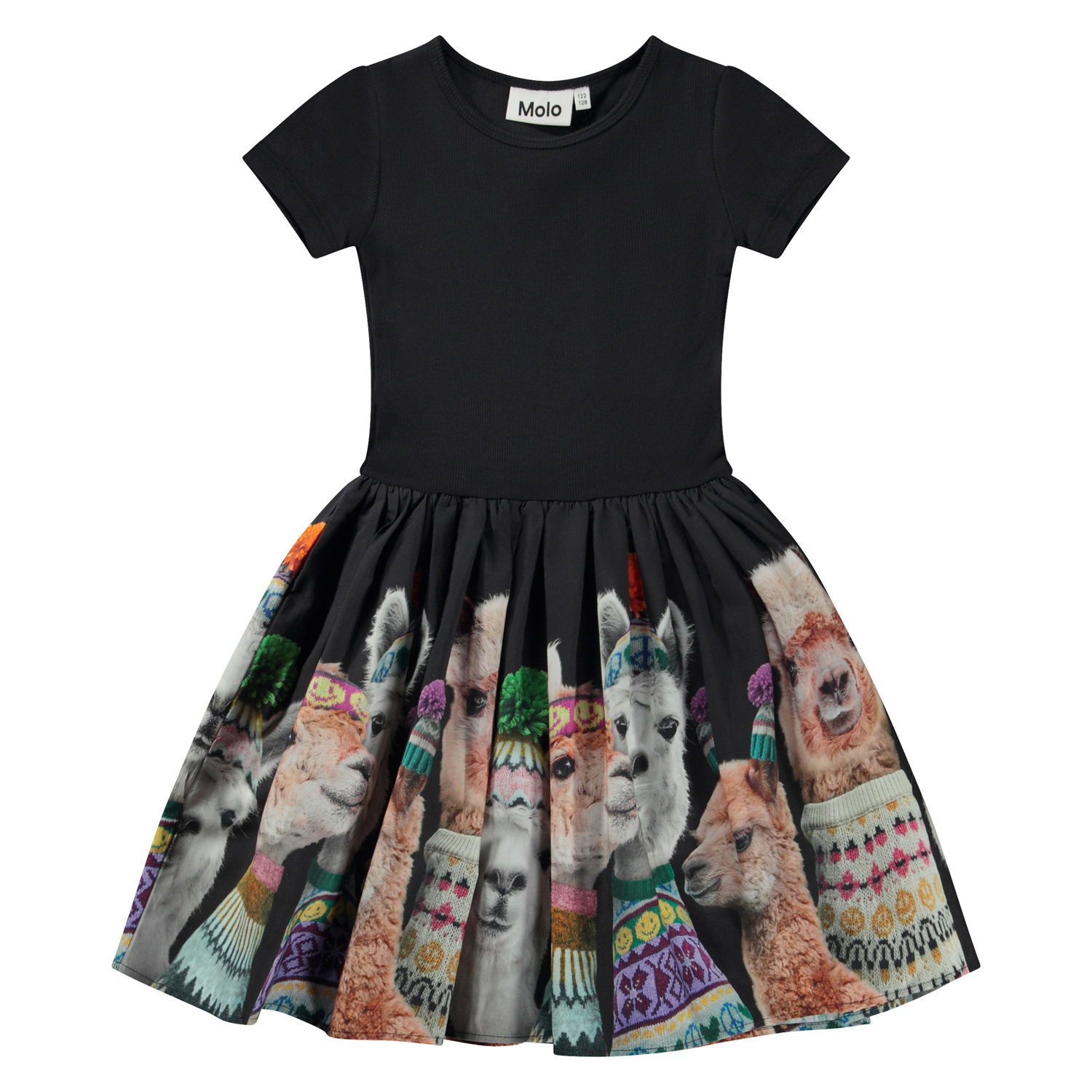 Black knee length, short sleeve dress with a poplin skirt in a lhama print. The humourous print shows two llamas that are wearing Molo's own knits, and they are all bundled up in hats, infinity scarves and jumpers. This dress is in 100% cotton, has a round neck, short sleeves, a very full poplin skirt and is in a slim fit.