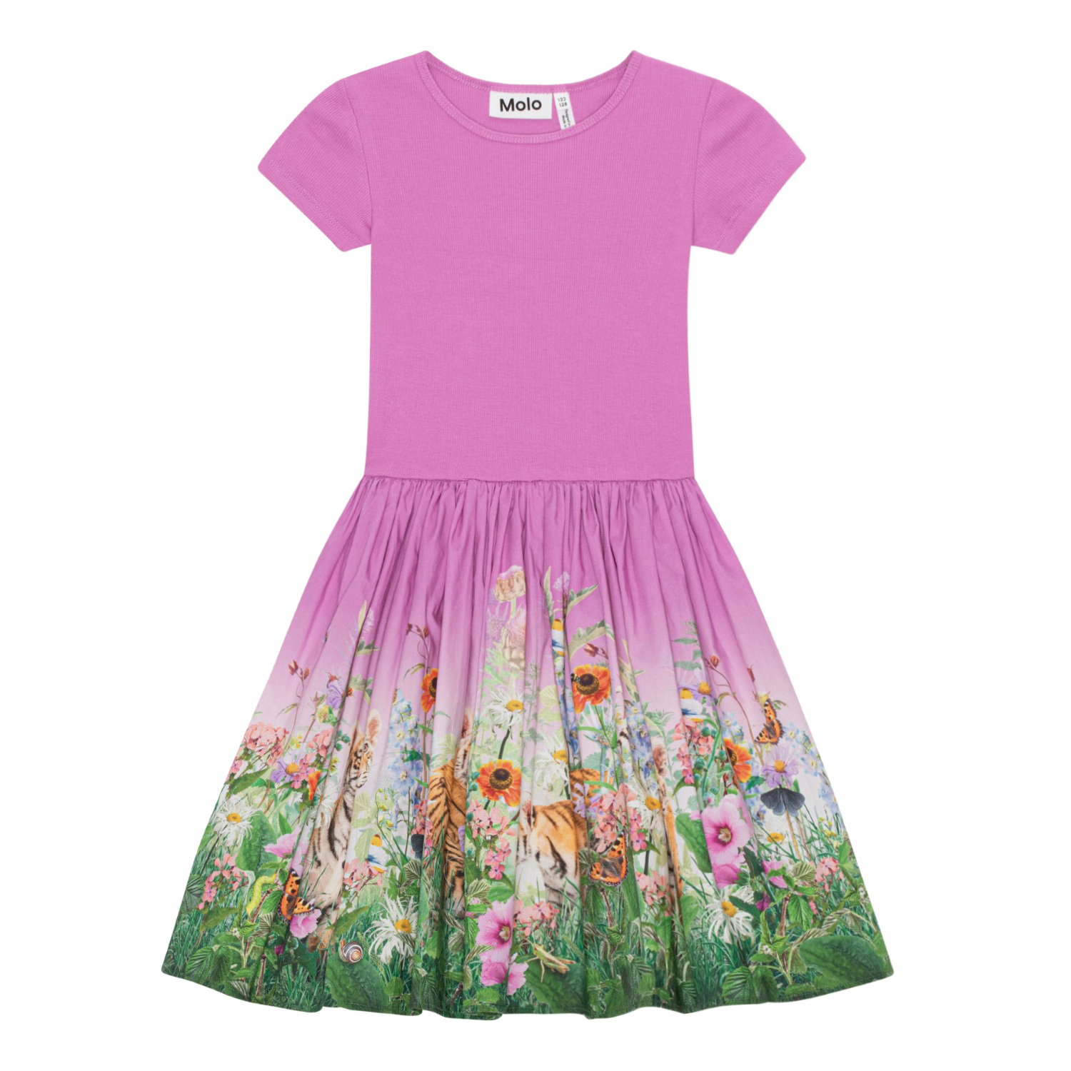 Purple, short sleeve dress with a circular skirt in organic cotton. The top is in a rib jersey and is snug fitting, while the skirt is in cotton poplin with a print of tiger cubs in a wild flower meadow.