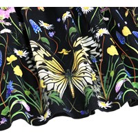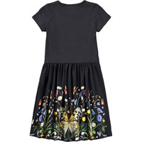 Black short-sleeved dress made of soft organic cotton. The top has a close-fit made of ribbed jersey, and the skirt is made of a stretchy jersey with a charming print of flowers and a butterfly. It is a comfortable and festive dress with plenty of room for movement.
