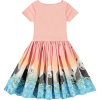 Pink short-sleeved dress in organic cotton with a fitted ribbed jersey top and poplin skirt. The dress has a regular fit with a colourful print on the skirt of pandas in a blue flower field.