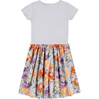 Light purple short-sleeved dress made of organic cotton with a fitting ribbed jersey top and smooth jersey skirt. The skirt has a colorful flower print on a purple background which gives the dress a fresh and lively expression.