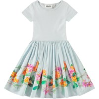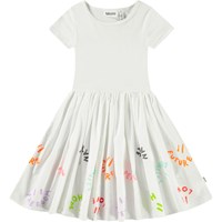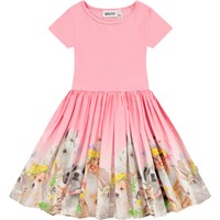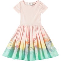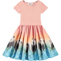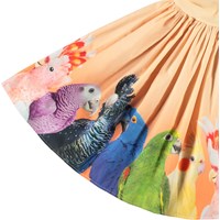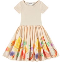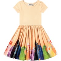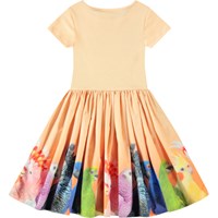 Light orange short-sleeved dress in organic cotton with a snug ribbed jersey top and poplin skirt. The dress has a regular fit with a colourful print on the skirt of beautiful rainbow parrots.