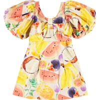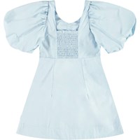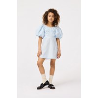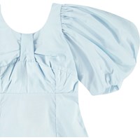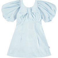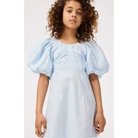 Light blue dress in organic cotton with puff sleeves. The dress has a fitted top with a bow detail across the chest and an invisible zip under the arm, making it easy to put on and take off. The skirt is A-line and falls to mid-thigh.