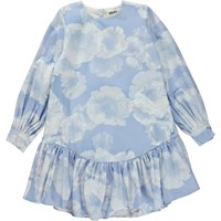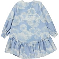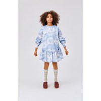 Cixi is a light blue dress in organic cotton. The dress has long sleeves with cuffs and a drop waist that gives it a loose fit. The dress has a concealed back zip closure and the all over Cloudy Poppies print with cloud shapes, that look like poppies, in a blue sky.