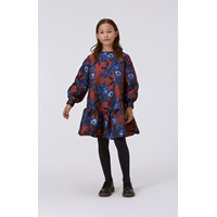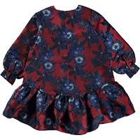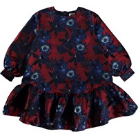 Bordeaux, knee length dress in jacquard with large blue flowers. This dress is in 100% polyester, which gives it a luxurious look. It has a round neck, a hidden back zip closure, long, full sleeves with cuffs, drop hip, a gathered, full skirt and is in an oversized fit. It's the perfect dress for every festive occassion