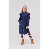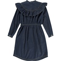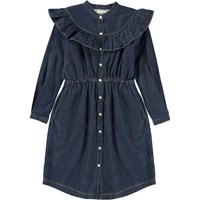 Clarissa is a dark blue denim dress with a button closure on the front. The dress has a ruffle edge on both the front and back. The dress also has an elastic waist and side pockets.