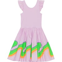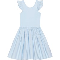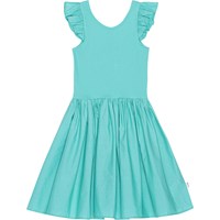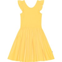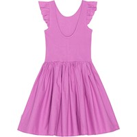 Pink, knee length dress in organic cotton. It has a circular skirt and a poplin ruffle at the shoulders. The top is in rib jersey and has a deep back.