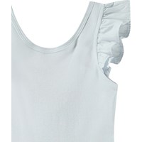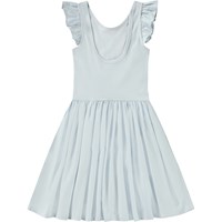Light blue knee-length dress in organic cotton with a poplin skirt. The top of the dress is in a of snug cotton rib, has ruffles on the shoulders, and a deep neckline at the back.