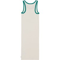 Off-white, snug fitting strap dress in organic cotton. It has green edge taping at the neck and armholes that matches the print on the front of the dress. The print is a logo with 'Team 2024', tennis racquets and flowers.