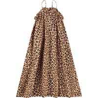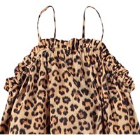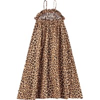 Loose dress with cheetah print in organic cotton. The dress falls to mid-calf, has thin straps, a deep back, and a pretty frill edge. The material of the dress is light and airy, making it ideal to take to the pool or beach.