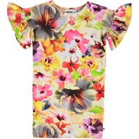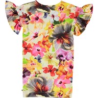 The blossoms are blooming in beautiful colours on the 'Pacific Floral' print on the Coralie dress. The dress has ruffle sleeves and a round neck.