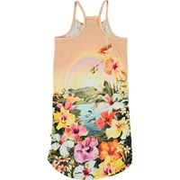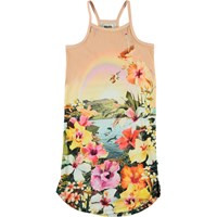 Cortney is a dress with straps with an exotic print of flowers, the ocean and dolphins. The dress is in 100% cotton and perfect for a trip to the beach. Certified by Ecocert Greenlife, certification no. 197496.